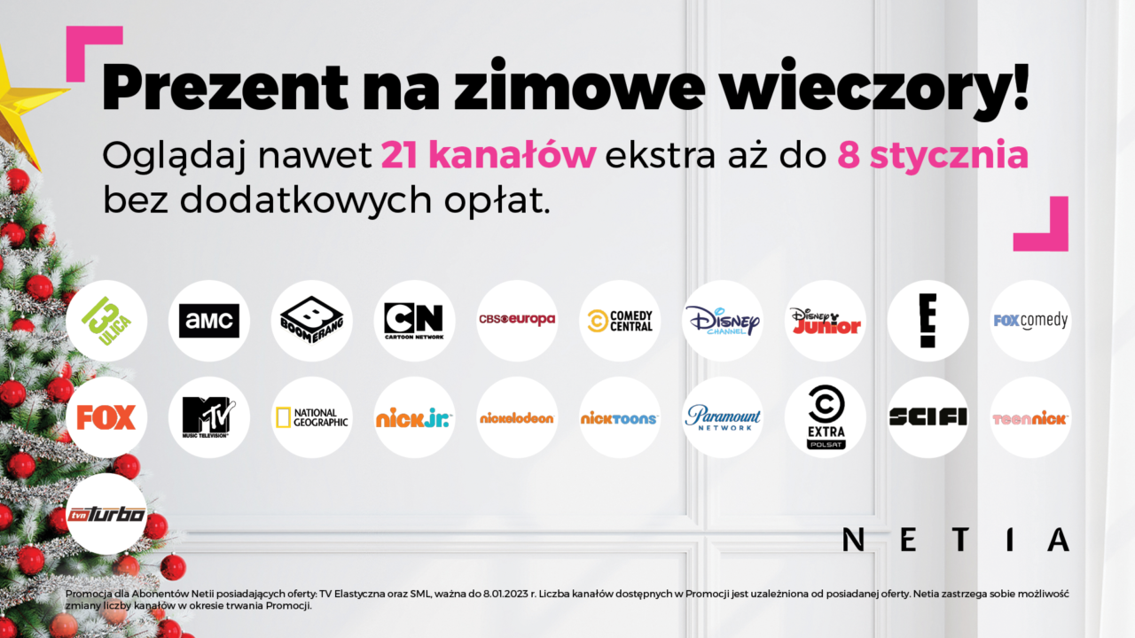 Na okres świąteczno-noworoczny Netia przygotowała prezent dla abonentów swoich usług TV. Do 8 stycznia 2023 roku nawet 21 kanałów telewizyjnych udostępnionych zostało bez dodatkowych opłat w tzw. oknie otwartym.