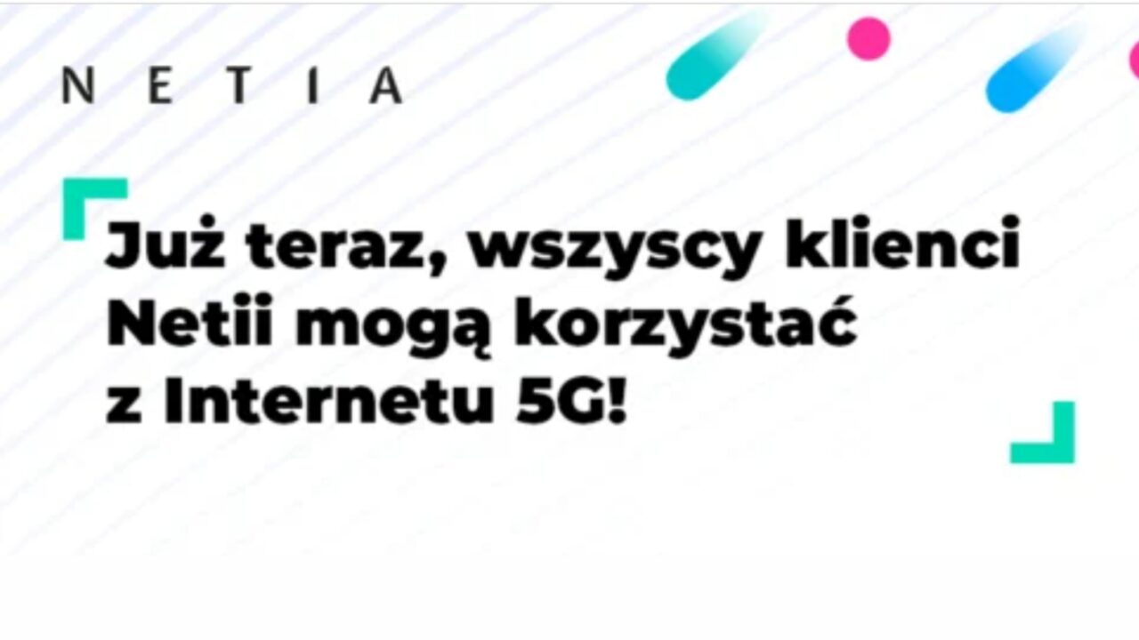 Technologia 5G jest już dostępna, bez dodatkowych opłat, we wszystkich planach taryfowych usług mobilnych Grupy Netia. Wkrótce abonenci usług mobilnych Netii, które działają na bazie sieci lidera technologii 5G w Polsce – operatora sieci Plus – będą mogli korzystać również w mobilnej transmisji danych o prędkości aż do 1 Gb/s.