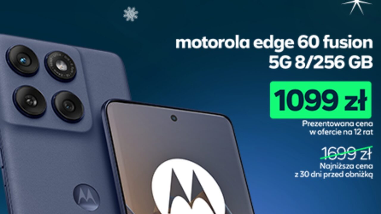Dobrym pomysłem na prezent może okazać się również motorola edge 60 fusion. Smartfon przyciąga uwagę oryginalną obudową wykonaną z tworzywa imitującego skórę. Dostępna jest w wyjątkowych kolorach więc z pewnością docenią ją osoby chcące wyróżnić się z tłumu. W świątecznej ofercie motorolę edge 60 fusion 5G 8/256 GB można kupić za 1099 zł – 1 zł na start – 12 rat po 91,49 zł/mies. (najniższa cena z ostatnich 30 dni: 1699 zł).